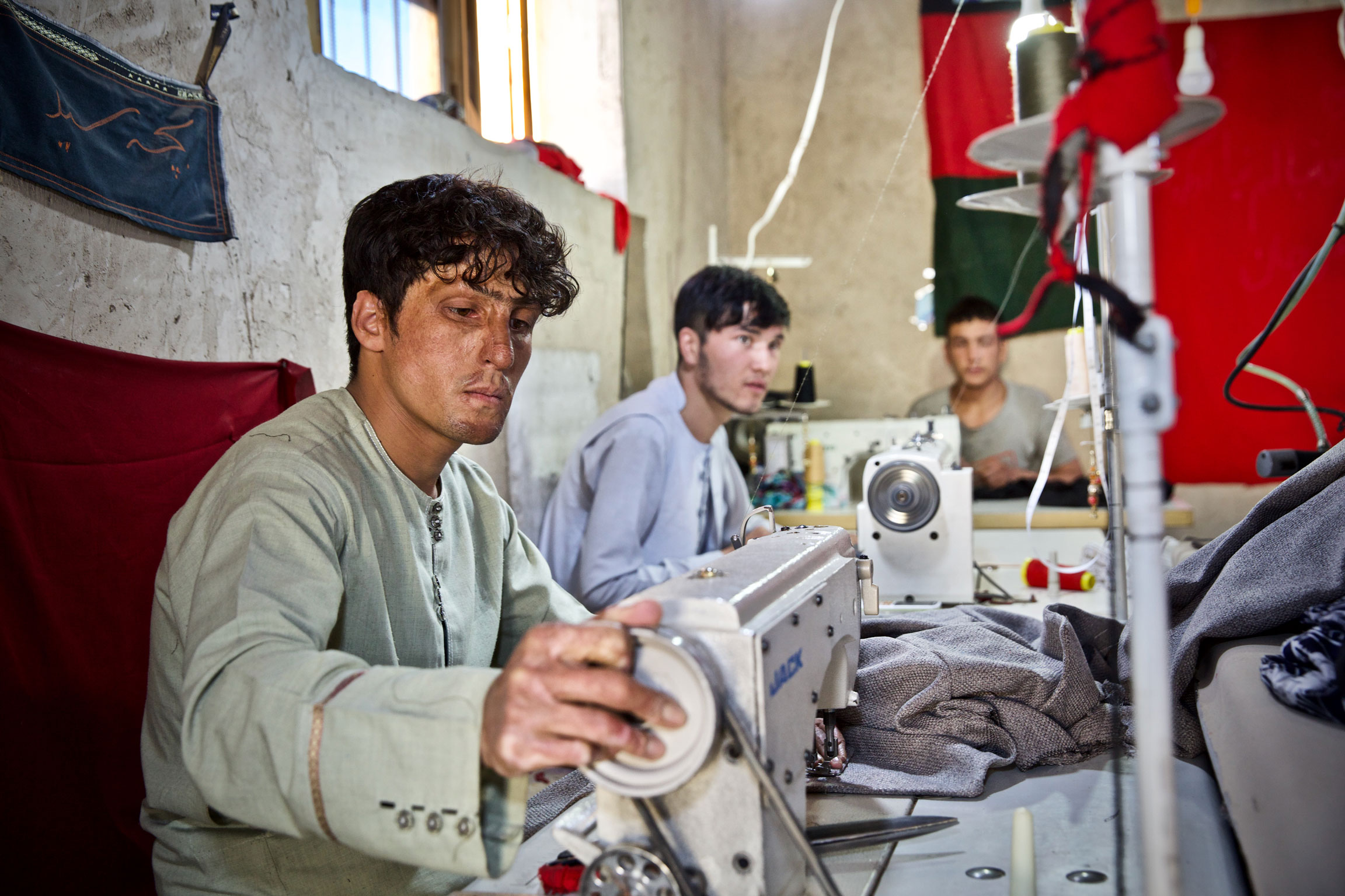 Bakom en av symaskinerna sitter Sayed Hassan. Han har en helt annan bakgrund än Sebatullah, förklarar han och håller fram två sargade händer.